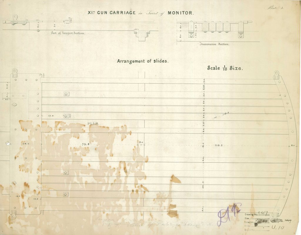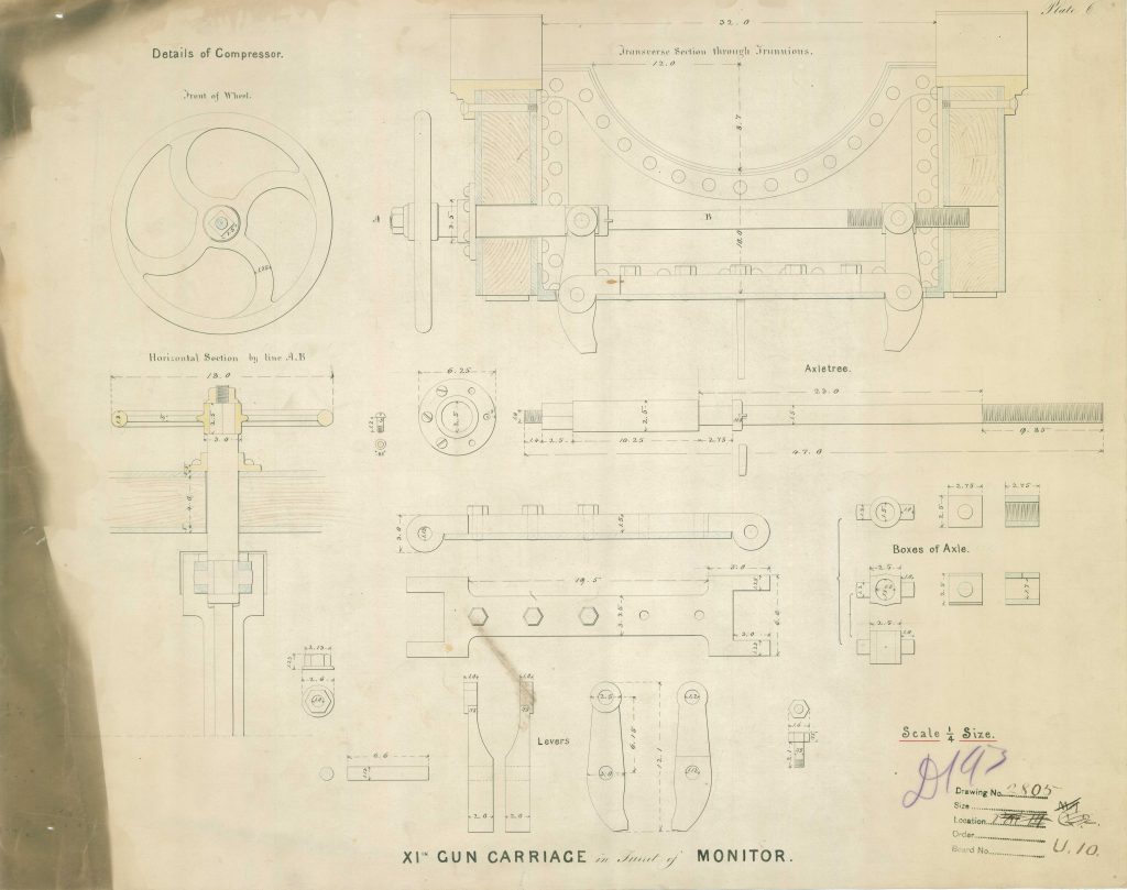 NARA’s Cartographic Branch recently completed more than 8,880 item descriptions for one of its highly referenced naval series, Construction and Design Drawings of Guns, Related Machinery and Parts, 1862-1921, which includes plans for the gun carriages housed within USS Monitor’s turret.