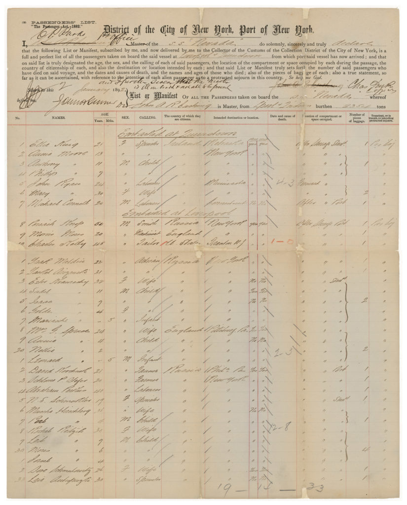 As a final note, continuing the theme of Irish history and immigration (though straying some decades beyond the data in AAD’s Irish Famine database), we bring up the famous story of the 13-year-old Irish girl Annie Moore, the first immigrant to be processed at Ellis Island. Her arrival is recorded in one of these surviving original manifests, for the SS Nevada, arriving January 2, 1892, also among those rescued by Dr. Glazier and now in the National Archives. Annie immigrated along with her brothers Anthony, aged 11, and Philip, aged 9, to New York to live with their parents, who arrived a few years prior and were living in Manhattan’s Lower East Side.