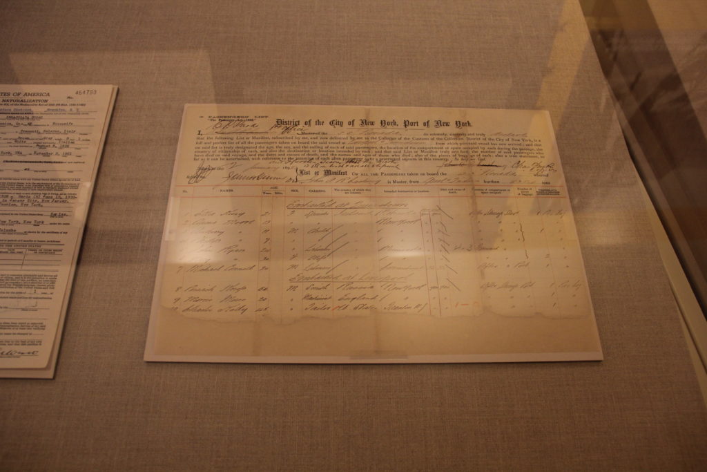 In 2011, in anticipation of moving our office from Varick Street to our new location at the Alexander Hamilton U.S Customs House at One Bowling Green, NY, staff sent select originals to our preservation labs for treatment and digitization. The Annie Moore record was in two pieces and scanned so you could see the full document (as in the picture above). As a result of the conservation treatment, the New York staff were able to display the top piece of the original document for the reopening of the National Archives at New York City, 2013. One view for a full year, in the Welcome Center’s New York on the Record Gallery, it was the first time Annie Moore’s record of arrival at Ellis Island was displayed to the public.