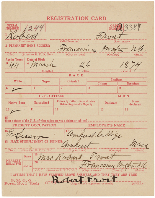 Robert Frost’s draft registration card was probably filled out in 1918, after March 26 of that year, given the age and birth date entered on the card. The WW1 draft was created by Congress May 14, 1917. The first registration day was June 5, 1917, for ages 21-30. The draft didn’t cover Frost’s age group until August 1918, when Congress broadened the age range to 18-45. Frost’s card was likely filled out during or after August 1918.